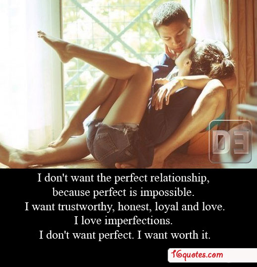 Everyone seeks and looks for the perfect relationship, but they don't understand that nothing is perfect and if there is no some little problems they won't value and appreciate the sweatiest and happiest moments of their relationship. I don't want the perfect relationship, because perfect is impossible. I want trustworthy, honest, loyal and love. I love imperfections. I don't want perfect. I want worth it. |